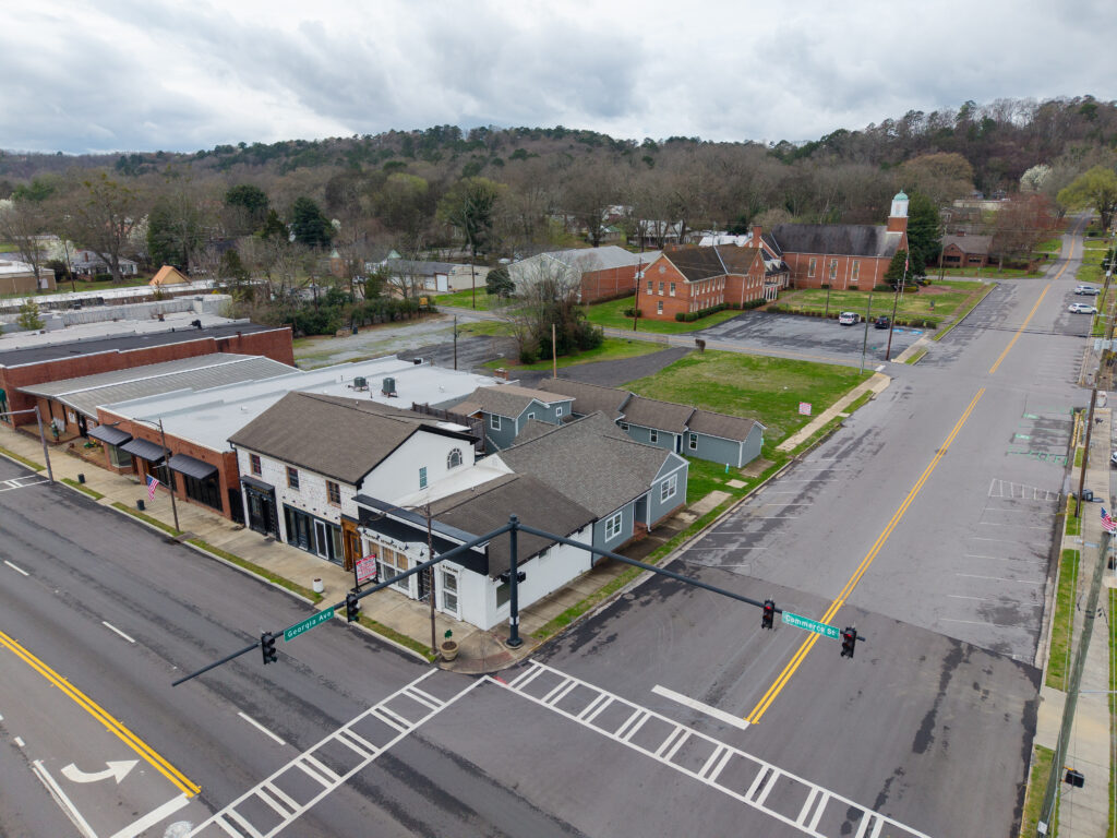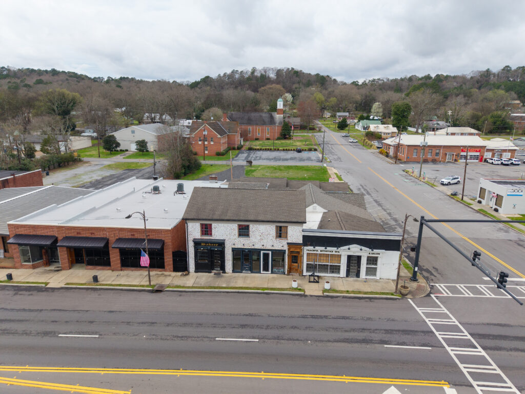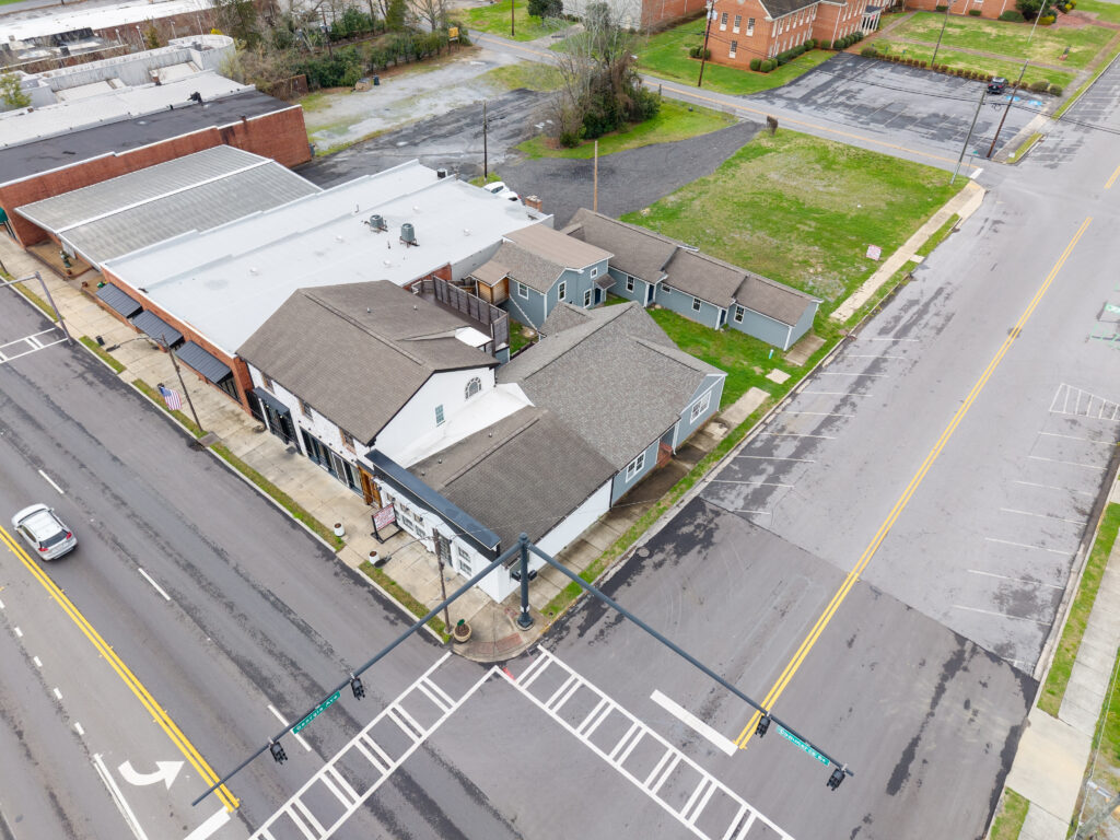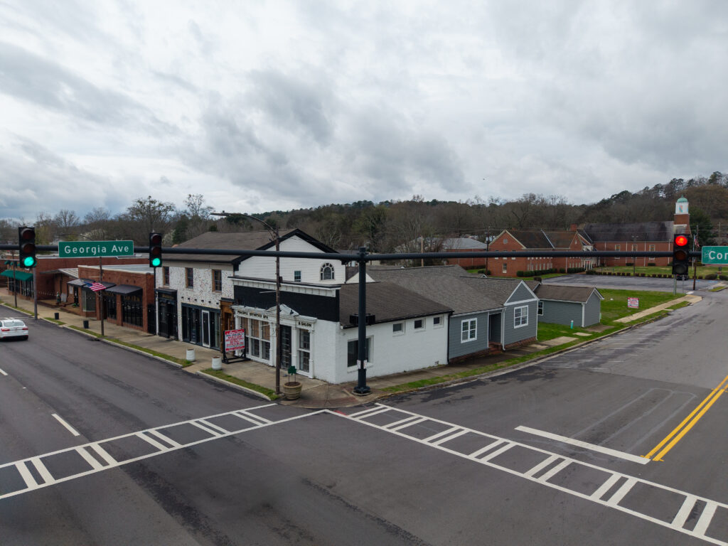 The three commercial units are entirely custom, designed with an emphasis on craftsmanship and authenticity. Notable details include bespoke finishes and a custom driftwood light fixture reclaimed from Weiss Lake, creating a distinctive sense of place rarely found in commercial build-outs.