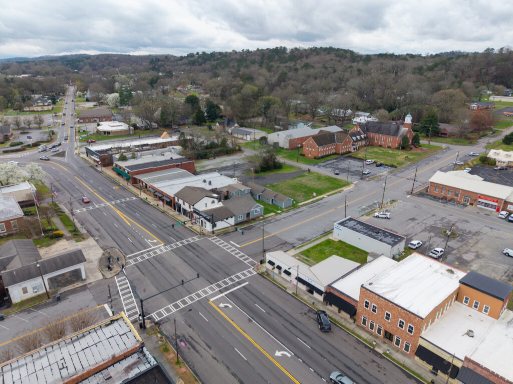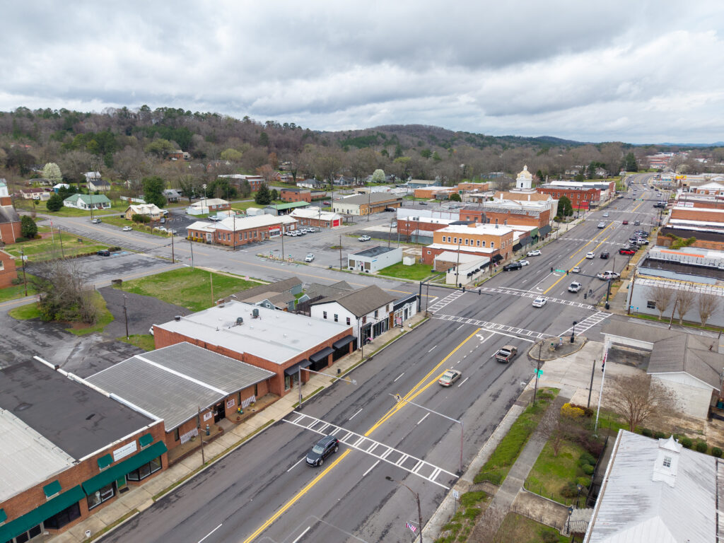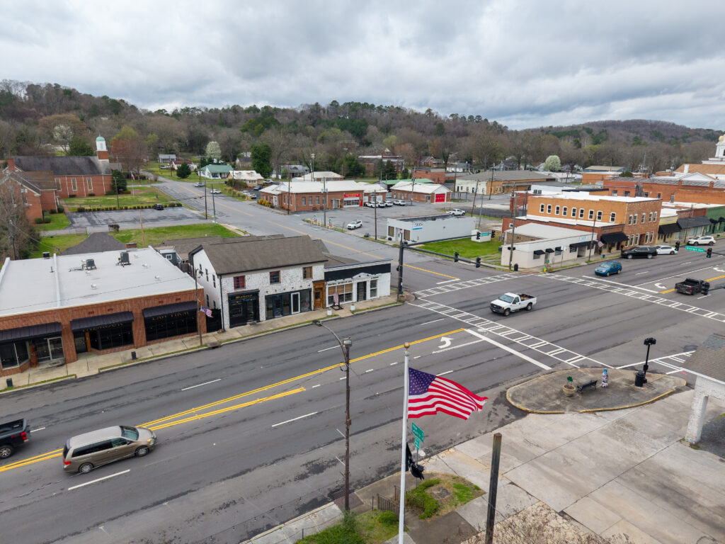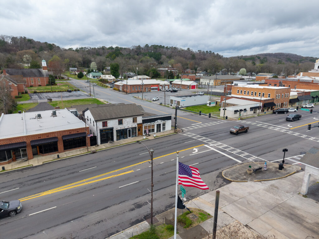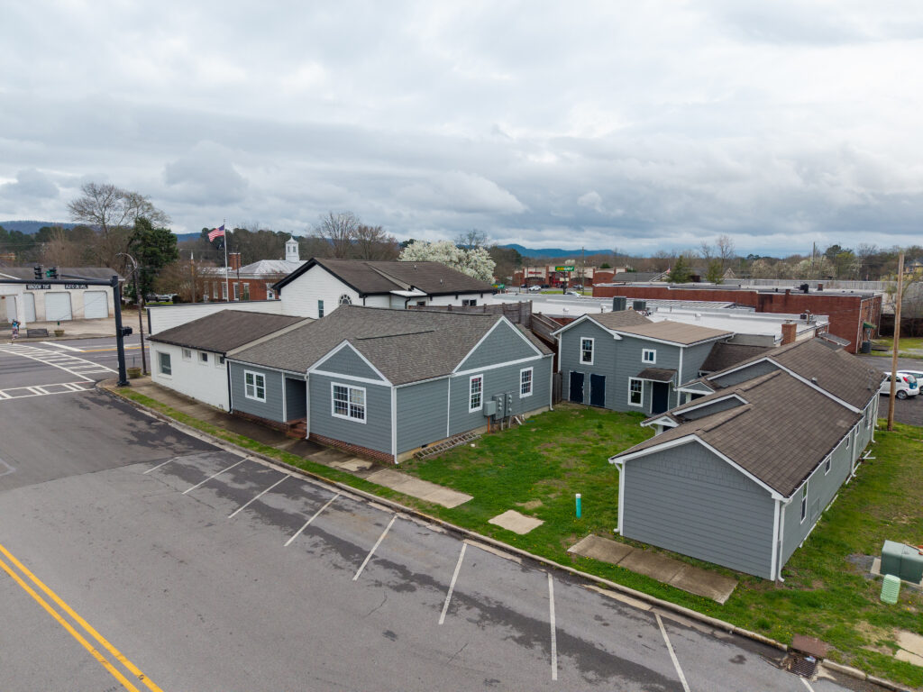 The three commercial units are entirely custom, designed with an emphasis on craftsmanship and authenticity. Notable details include bespoke finishes and a custom driftwood light fixture reclaimed from Weiss Lake, creating a distinctive sense of place rarely found in commercial build-outs.